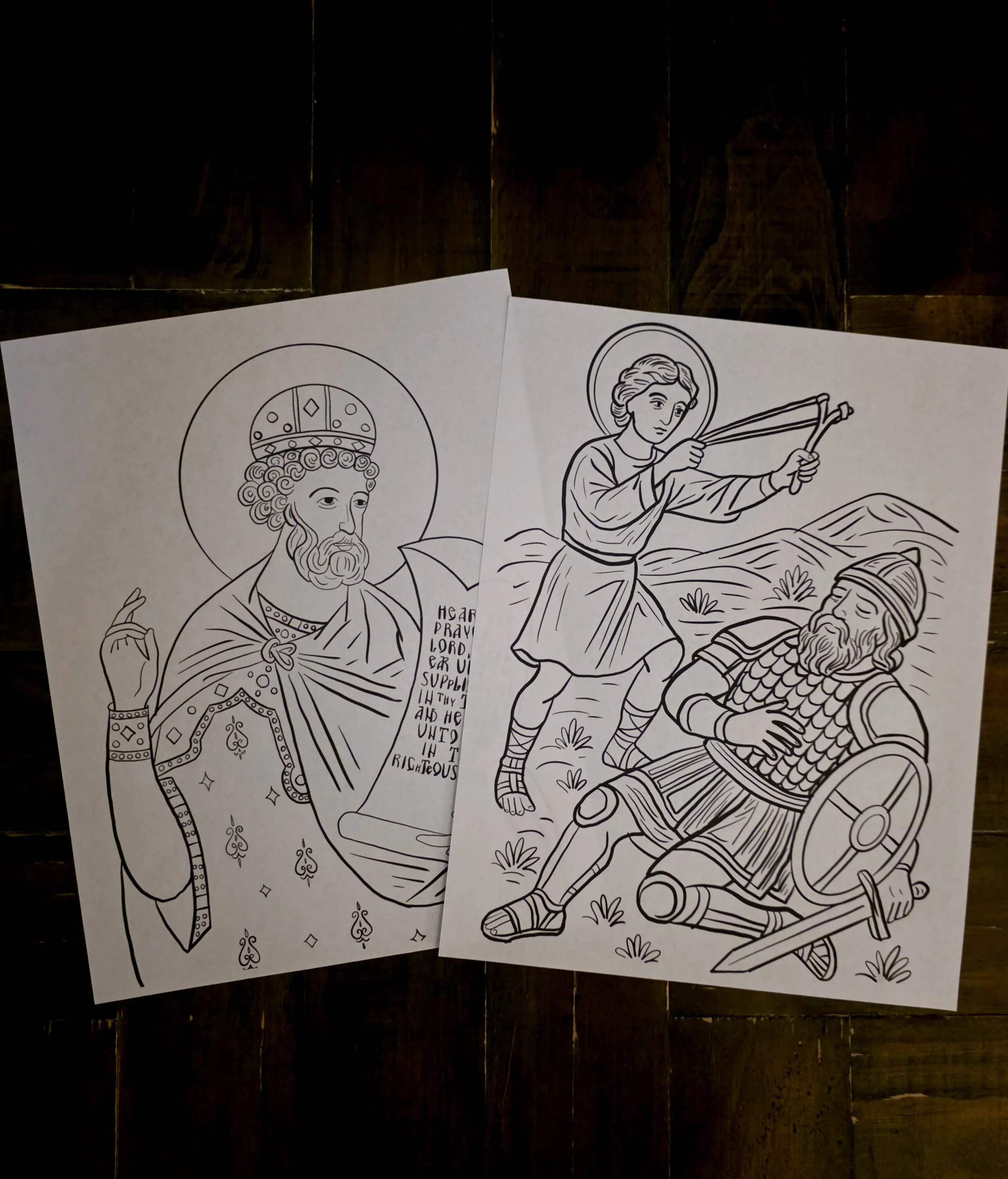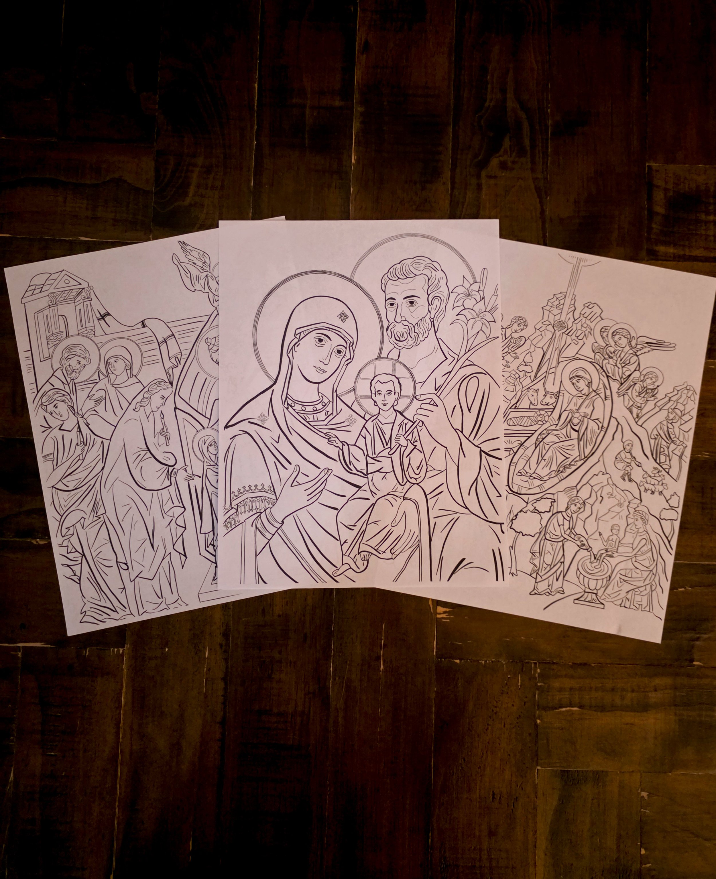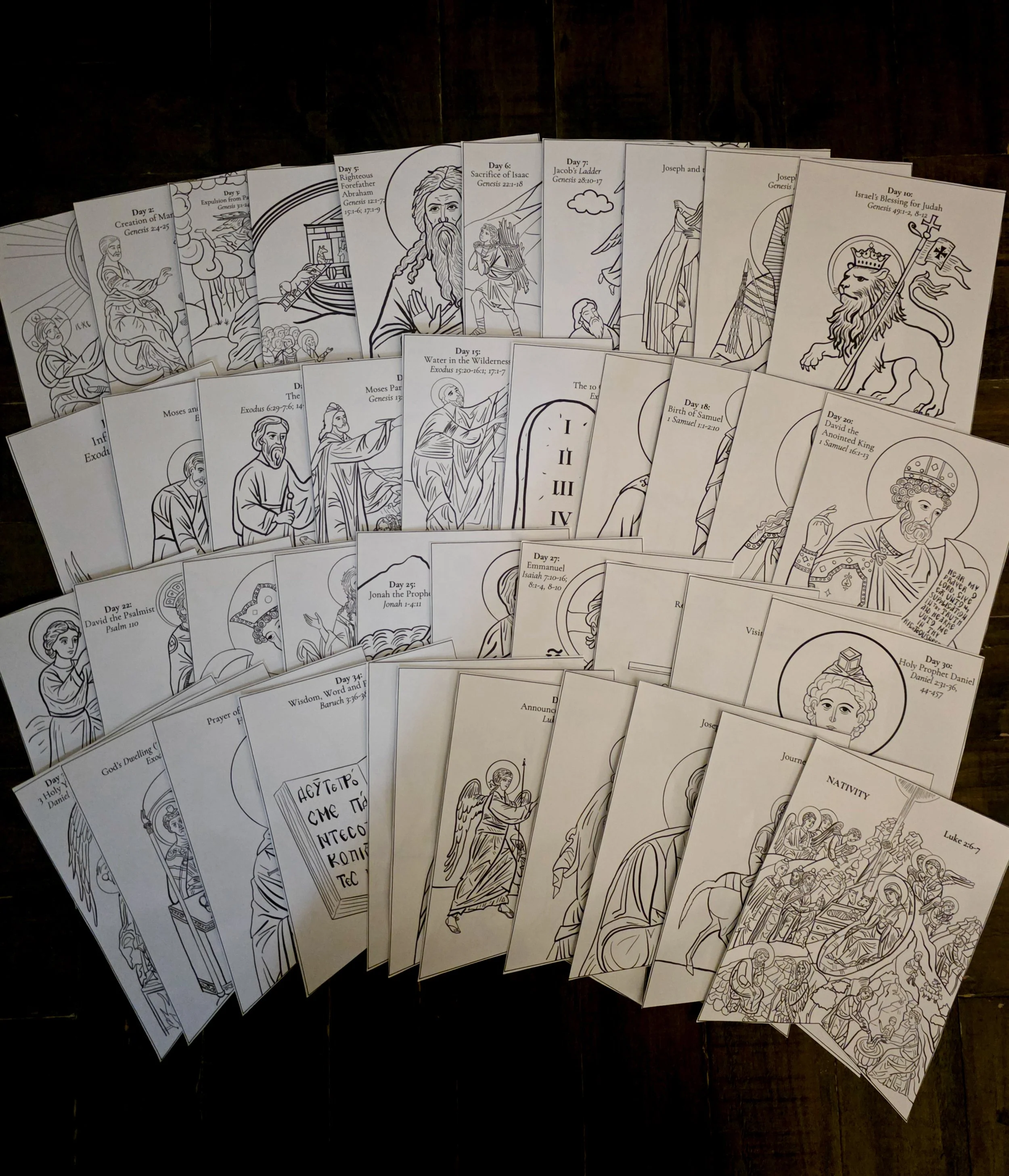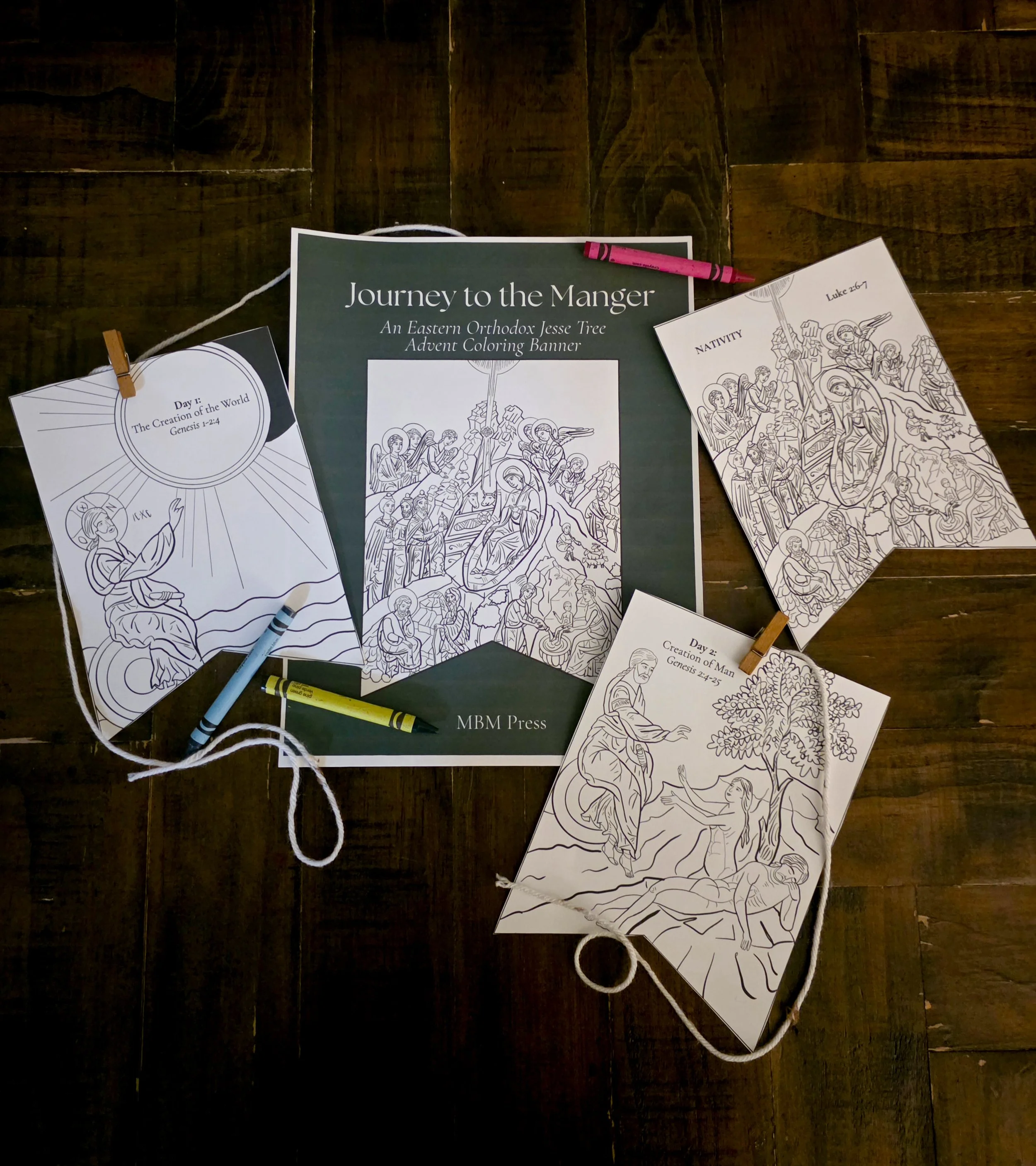A 42-page Nativity coloring book with hand-drawn Biblical and icon-inspired illustrations.Journey to the Manger: An Orthodox Jesse Tree Advent Coloring Banner